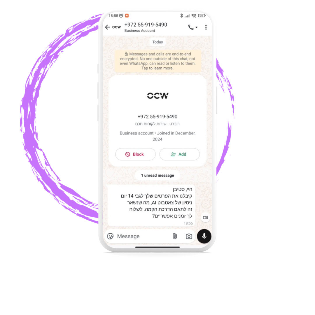 קבעו עכשיו שיחה טלפונית עם המנהל הטכנולוגי והוא יגדיר עבורכם צ'אטבוט חכם לעסק ל-7 יום – ללא עלות וללא התחייבות