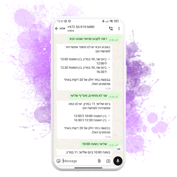 צ'אטבוט קובע פגישות על ידי הצגת זמנים פנוים מתוך היומן, מאפשר ללקוח לבחור את הזמן המתאים לו ומאמת את הפרטים. ברגע שהפגישה נקבעה, הצ'אטבוט מעדכן אוטומטית את היומן שלכם. אם יש שינויים, הבוט מעדכן את כל הצדדים בצורה אוטומטית